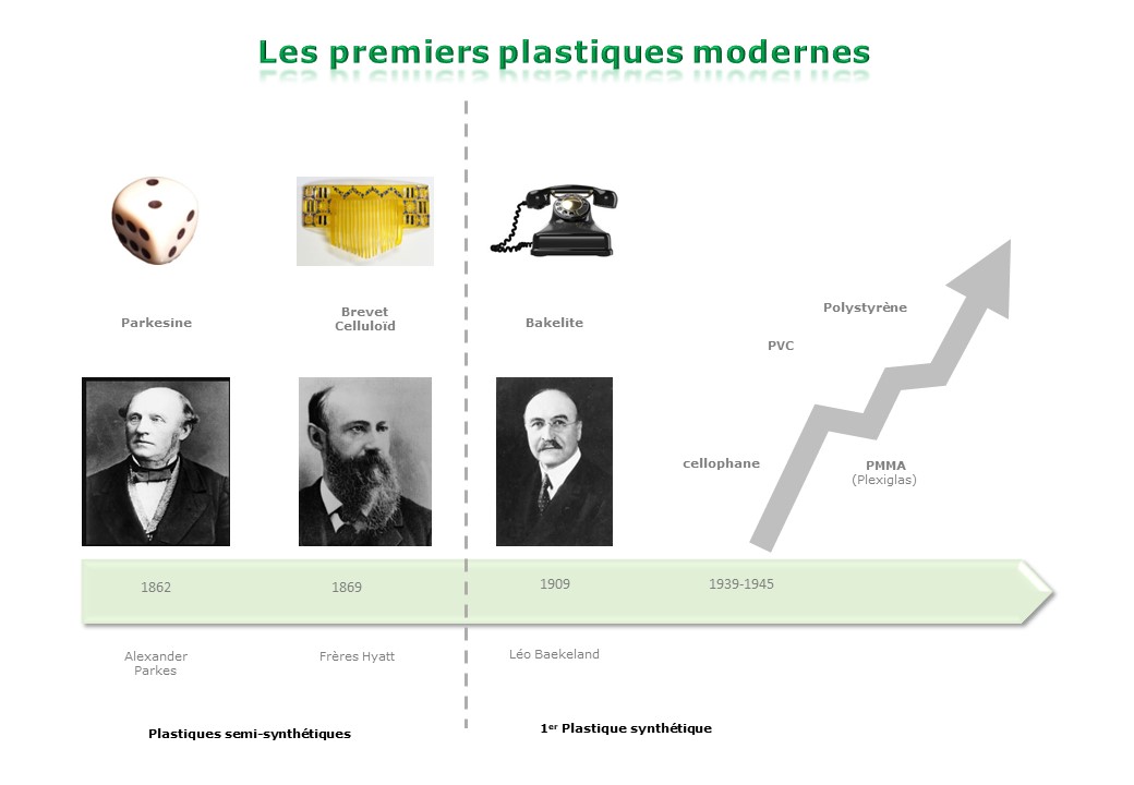 Cependant, c’est à partir de la fin du XIXème siècle que commence la mise au point de nouvelles matières : les plastiques semi-synthétiques faits de polymères naturels modifiés par des produits chimiques.
