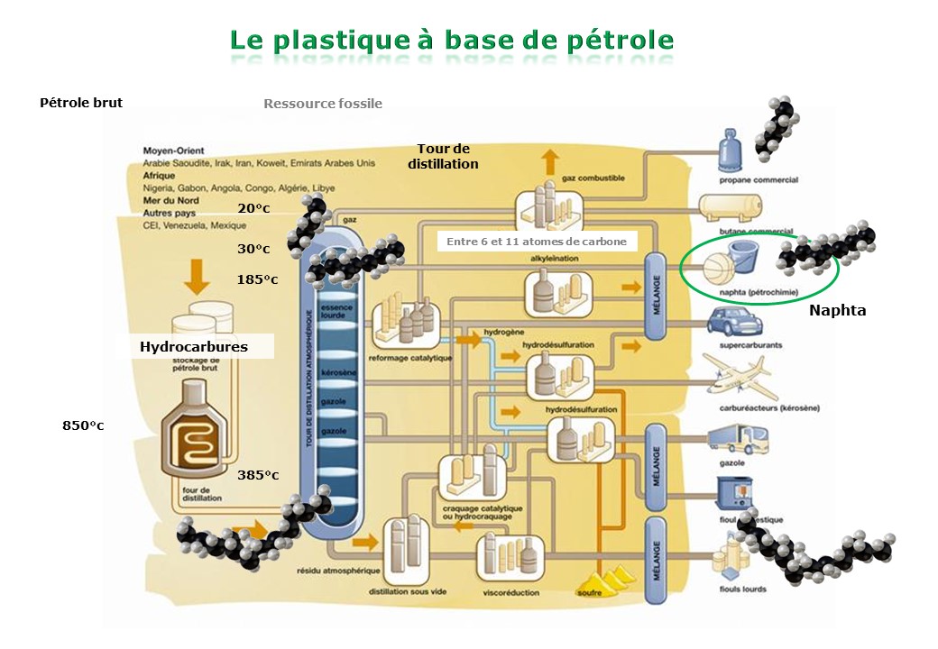 Les naphtas avec lesquels on fabrique les plastiques sont récupérés entre 180°c et 30°c. Leurs molécules comportent entre 6 et 11 atomes de carbones.