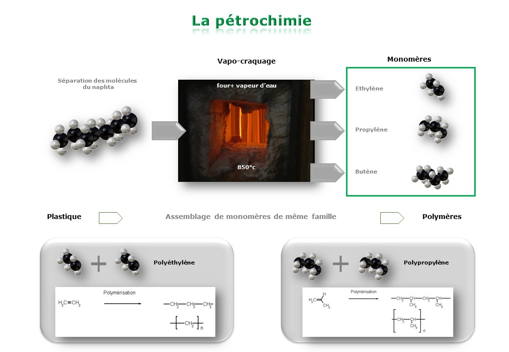 La pétrochimie : fabrication du plastique à partir du Naphta .