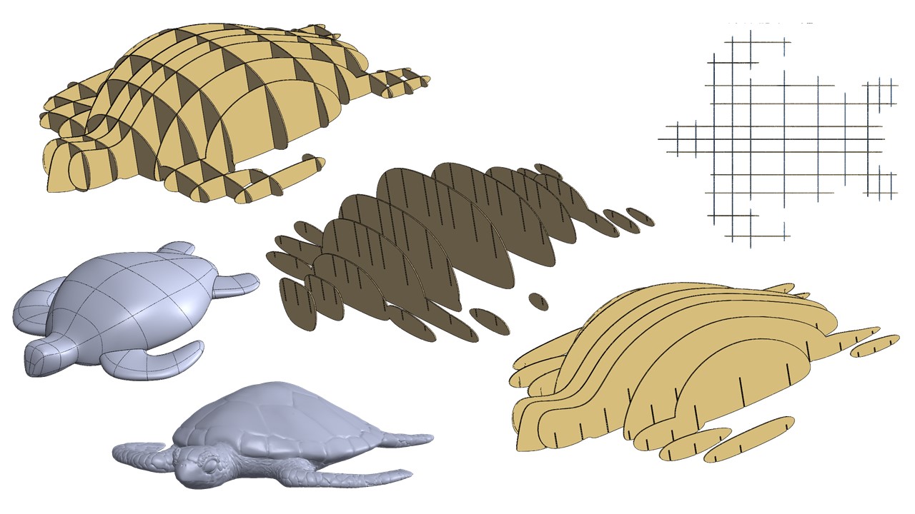 Un modèle 3D simplifié d'une tortue a été réalisé. A partir de ce modèle, une structure a été conçue avec des panneaux transversaux et longitudinaux qui seront réalisés en cartons sur laquelle sera apposé un grillage et une peau en papier mâché.